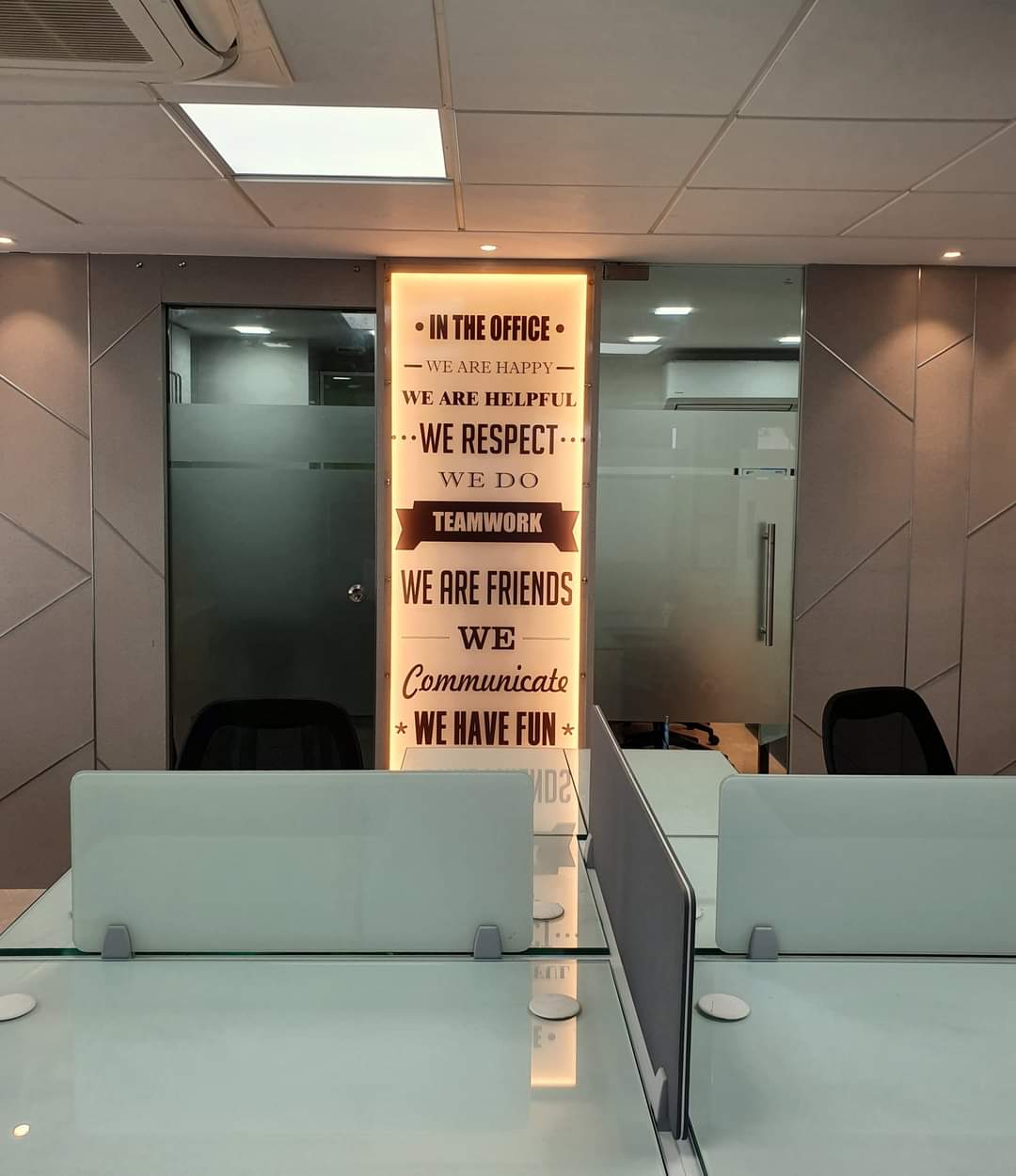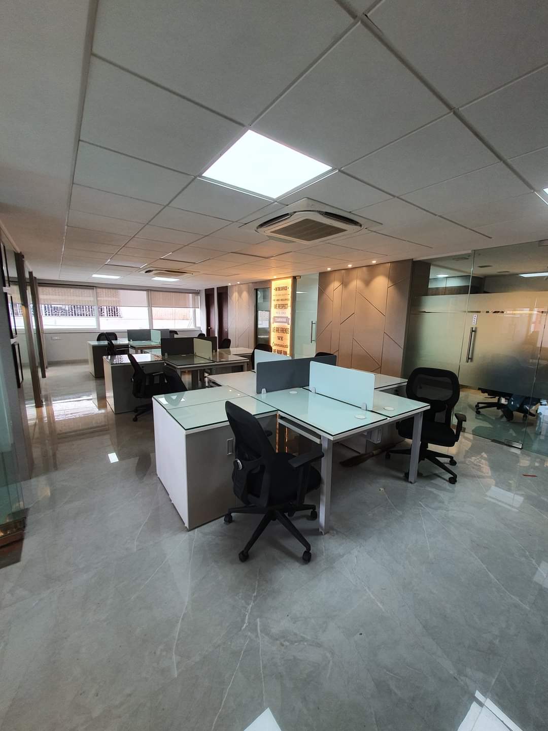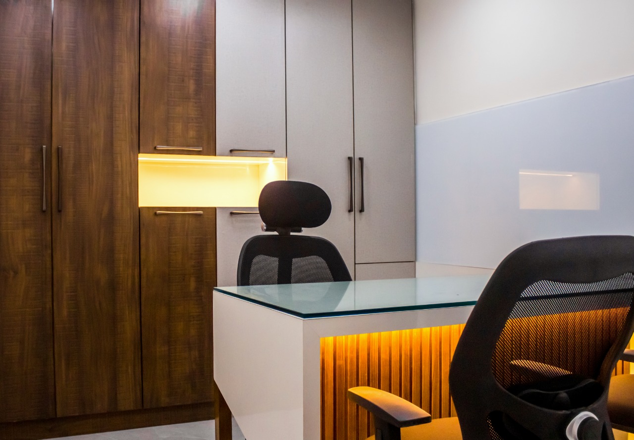 Step into our inviting office space, where warmth radiates from the harmonious blend of soft whites, elegant glass features, and rich wood accents. The airy ambiance created by the strategic use of warm whites evokes a sense of tranquility and comfort, inviting productivity and creativity to flourish. Glass elements add a touch of sophistication, promoting transparency and openness throughout the space. Meanwhile, the natural beauty of wood infuses the environment with warmth and character, fostering a connection to nature within the workplace.